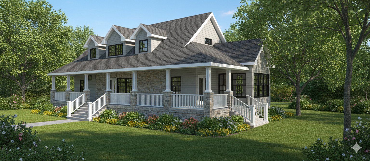 This house was designed as a home for a young couple and their son. Living quarters for the young couple are on the second floor. A small kitchen and divided entrance serve the second floor. Occupying the first floor are the couples aging parents who are in need of monitored care. Features of the first floor include a wrap around porch, sun room, and handicap accessible living areas, kitchen and bathroom. This living arrangement allows for independent senior living, while any assistance needed is close by. The private quarters upstairs for the young couple create and oasis of privacy when needed. The house eventually will have the upstairs kitchen removed, therefore easily returning to a single family home.